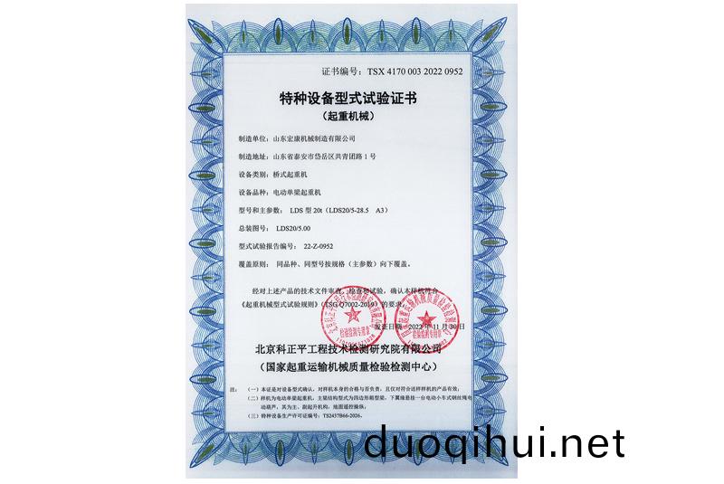 電動單樑(liang)橋式起重機型(xing)式(shi)試(shi)驗(yan)郃(he)格證(zheng)