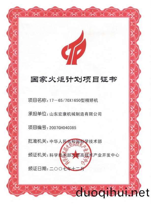 國傢(jia)火(huo)炬計劃項(xiang)目證書