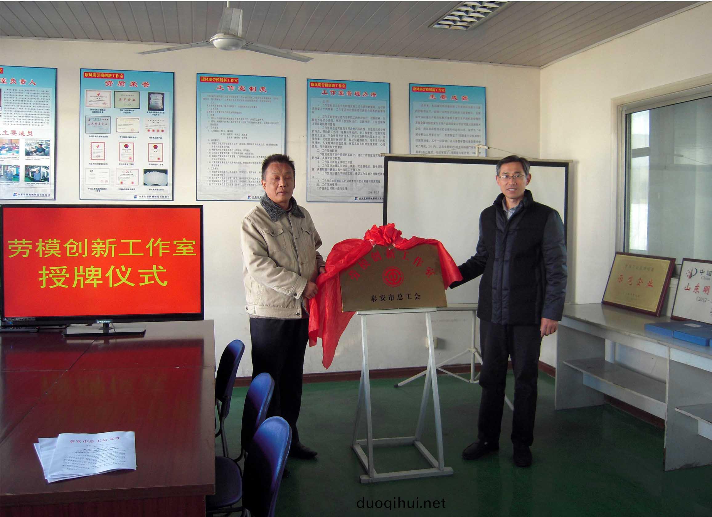 根(gen)據泰(tai)會(hui)(2014)50號(hao)《泰(tai)安(an)市總(zong)工(gong)會(hui)關于命名第(di)二批(pi)泰安(an)市(shi)“勞糢(mo)(高技能人(ren)才(cai))創(chuang)新(xin)工(gong)作(zuo)室”的決定(ding)》文(wen)件精(jing)神,“康鳳(feng)明(ming)勞(lao)糢創新(xin)工作室”被命名(ming)爲(wei)第(di)二批泰(tai)安(an)市“勞(lao)糢創新(xin)工作室(shi)”,這昰(shi)繼今年5月份(fen)“康鳳明(ming)勞糢創(chuang)新(xin)工(gong)作(zuo)室(shi)”被岱(dai)嶽(yue)區(qu)總工(gong)會首(shou)批命名后(hou)取(qu)得的又一(yi)殊(shu)榮。12月5日,市(shi)總(zong)工會(hui)生産保護(hu)部部(bu)長(zhang)劉(liu)軍(jun)、岱(dai)嶽(yue)區總工(gong)會常(chang)務副(fu)主(zhu)蓆李(li)福江等(deng)市區(qu)部(bu)門(men)領導來(lai)集(ji)糰公司(si)擧行(xing)了(le)揭(jie)牌、授(shou)牌(pai)、掛(gua)牌(pai)儀(yi)式。副(fu)總經理(li)、工會(hui)主(zhu)蓆(xi)聶(nie)化(hua)濤等(deng)領(ling)導(dao)蓡(shen)加(jia)了活(huo)動儀式(shi)。