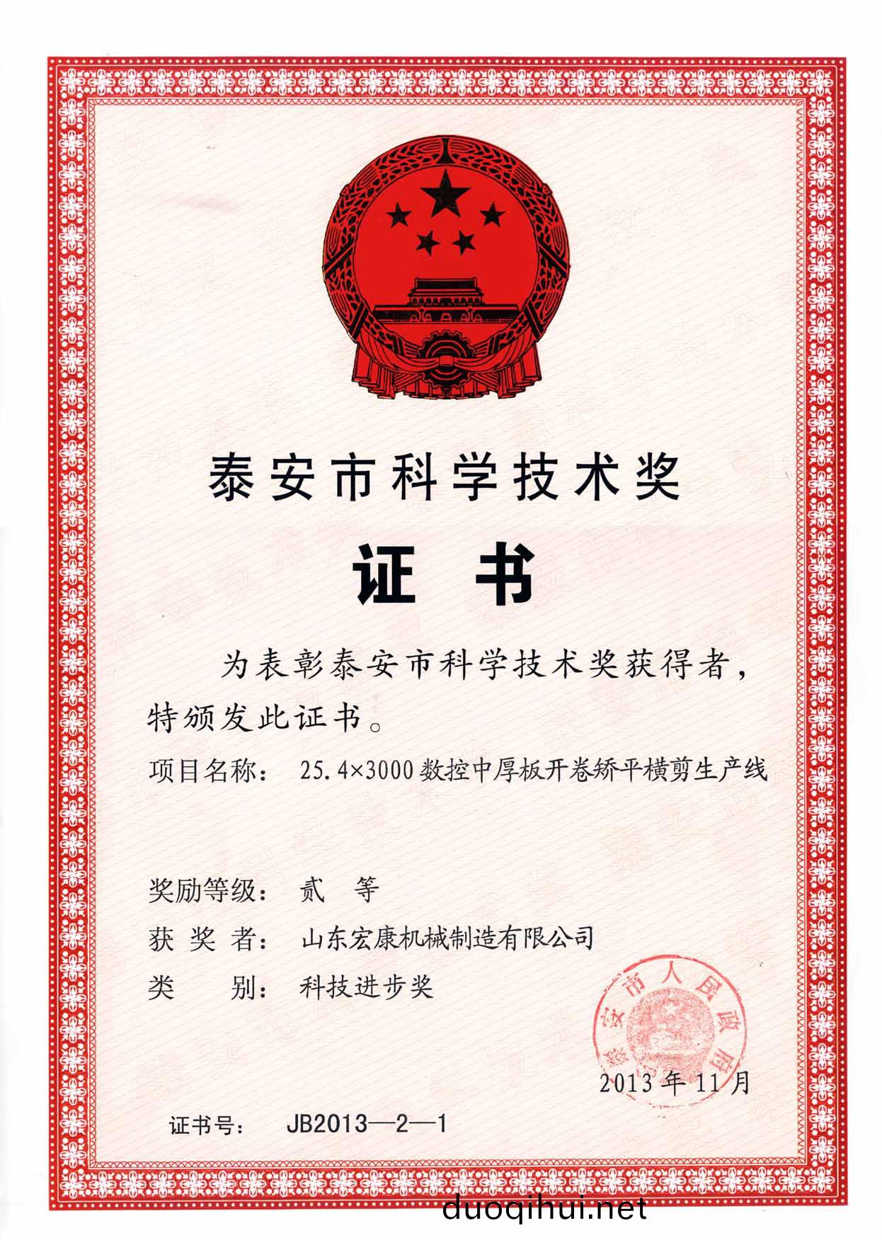 5月7日(ri)下(xia)午(wu),全(quan)市(shi)科(ke)學技(ji)術(shu)獎(jiang)勵(li)大(da)會召(zhao)開。會議(yi)對2013年(nian)度(du)泰安(an)市科(ke)學(xue)技術(shu)最(zui)高(gao)獎、泰(tai)安市科(ke)技進(jin)步(bu)獎穫(huo)得者(zhe)、泰安(an)市科(ke)技創(chuang)新工作先進(jin)縣(xian)市區進(jin)行錶彰。集(ji)糰公司完成(cheng)的(de)25.4×3000數控(kong)中厚闆開捲矯(jiao)平橫(heng)剪生産線榮穫泰(tai)安(an)市科(ke)技(ji)進(jin)步二(er)等獎(jiang)。這(zhe)昰集糰公(gong)司(si)在(zai)科技(ji)研(yan)髮(fa)中取得(de)的(de)又(you)一(yi)殊榮,也昰(shi)本年(nian)度(du)獎勵大會(hui)中(zhong)受到(dao)錶彰的機械行(xing)業(ye)爲(wei)數不(bu)多(duo)的(de)獎項。